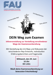 Am Mittwoch, den 29. Juni, sind interessierte Studierende herzlich zur Informationsveranstaltung „DEIN Weg zum Examen“ eingeladen. Los geht es um 16 Uhr im Kollegienhaus Raum 1.011. Gegenstand der Veranstaltung wird die Vorstellung verschiedener Wege der Examensvorbereitung (inklusive des Uni-Reps) sein sowie eine Diskussion mit individuellen Erfahrungsberichten und einer Fragerunde.
