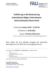 Der Lehrstuhl für Steuerrecht (Professor Dr. Michael Fischer) lädt am Freitag, den 18.06.2021, von 10:00 – 17:30 Uhr ganz herzlich zum Vortrag „Einführung in die Besteuerung international tätiger Unternehmen (Internationales Steuerrecht)“ ein. Der Dozent Christian Ehlermann ist Partner der Steuerabteilung Ernst & Young GmbH Wirtschaftsprüfungsgesellschaft.