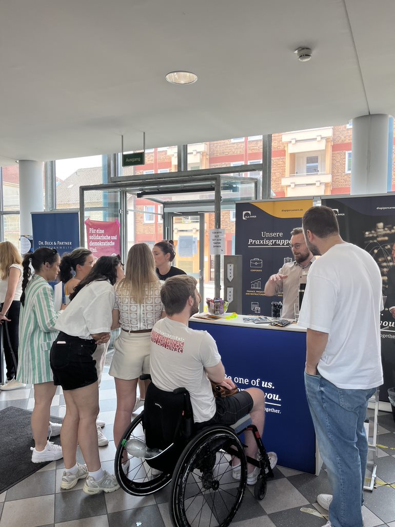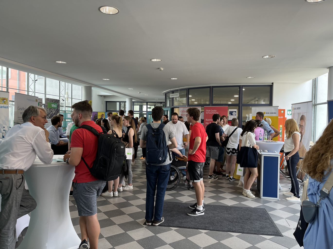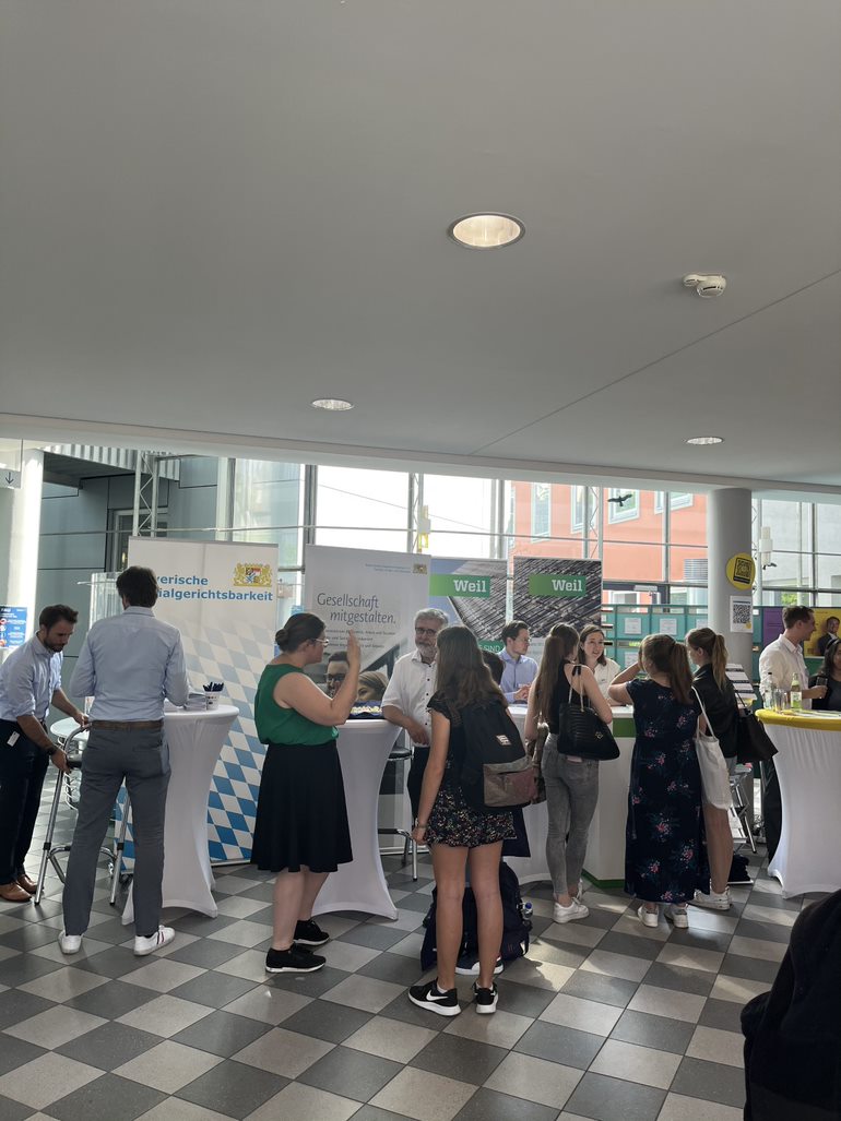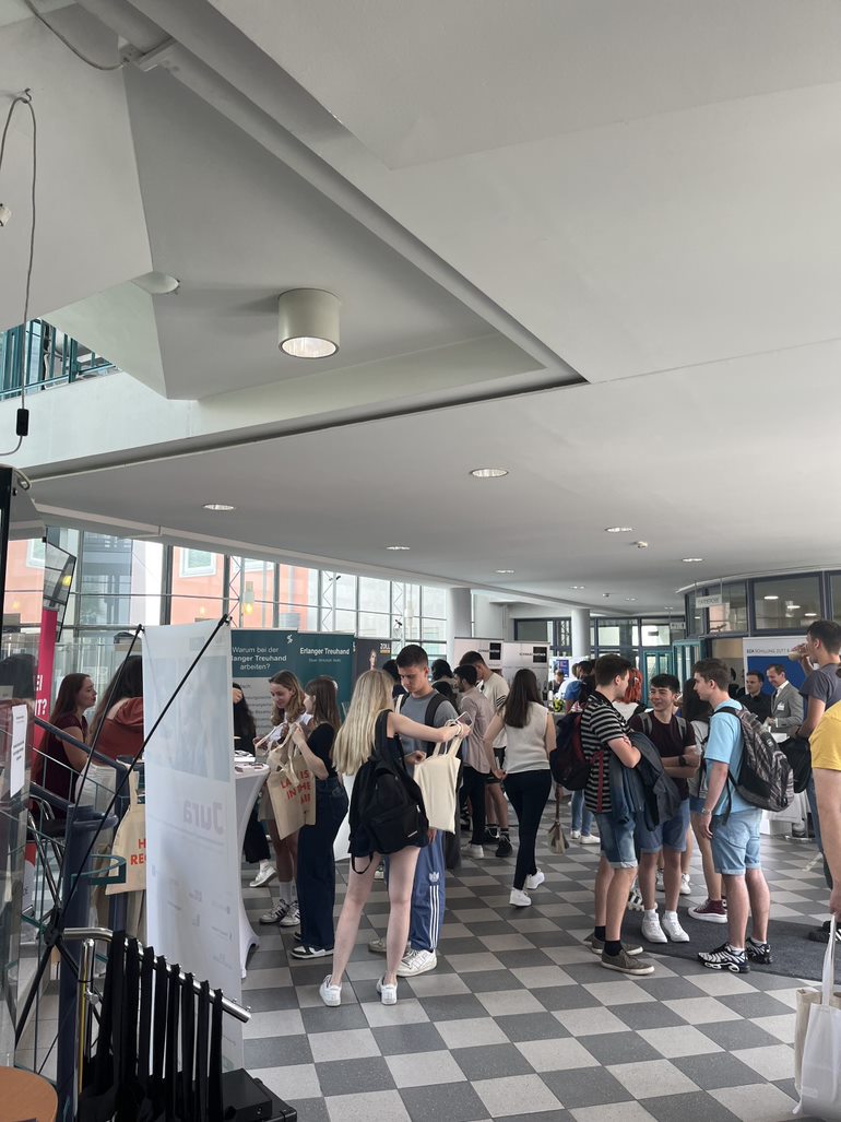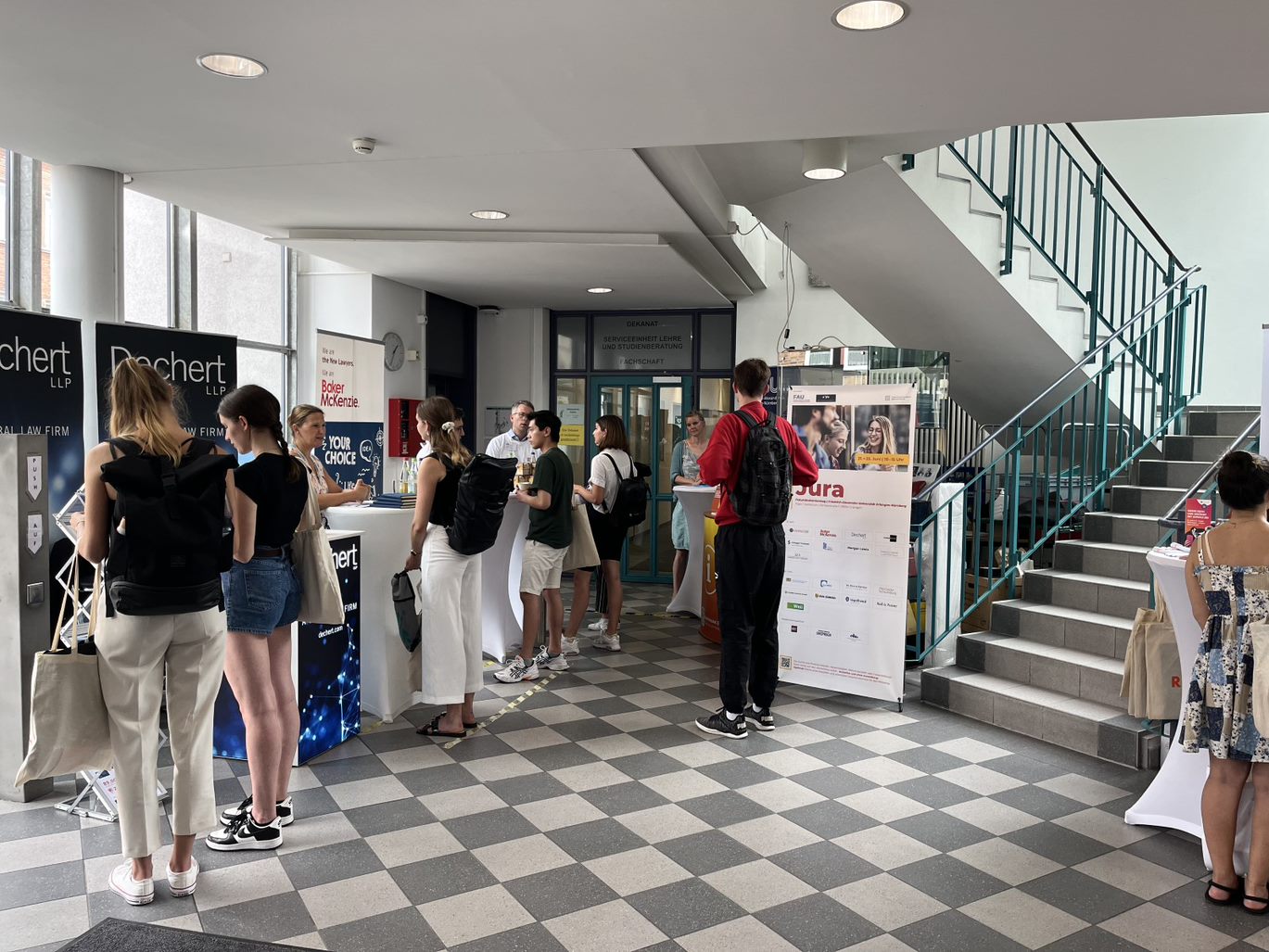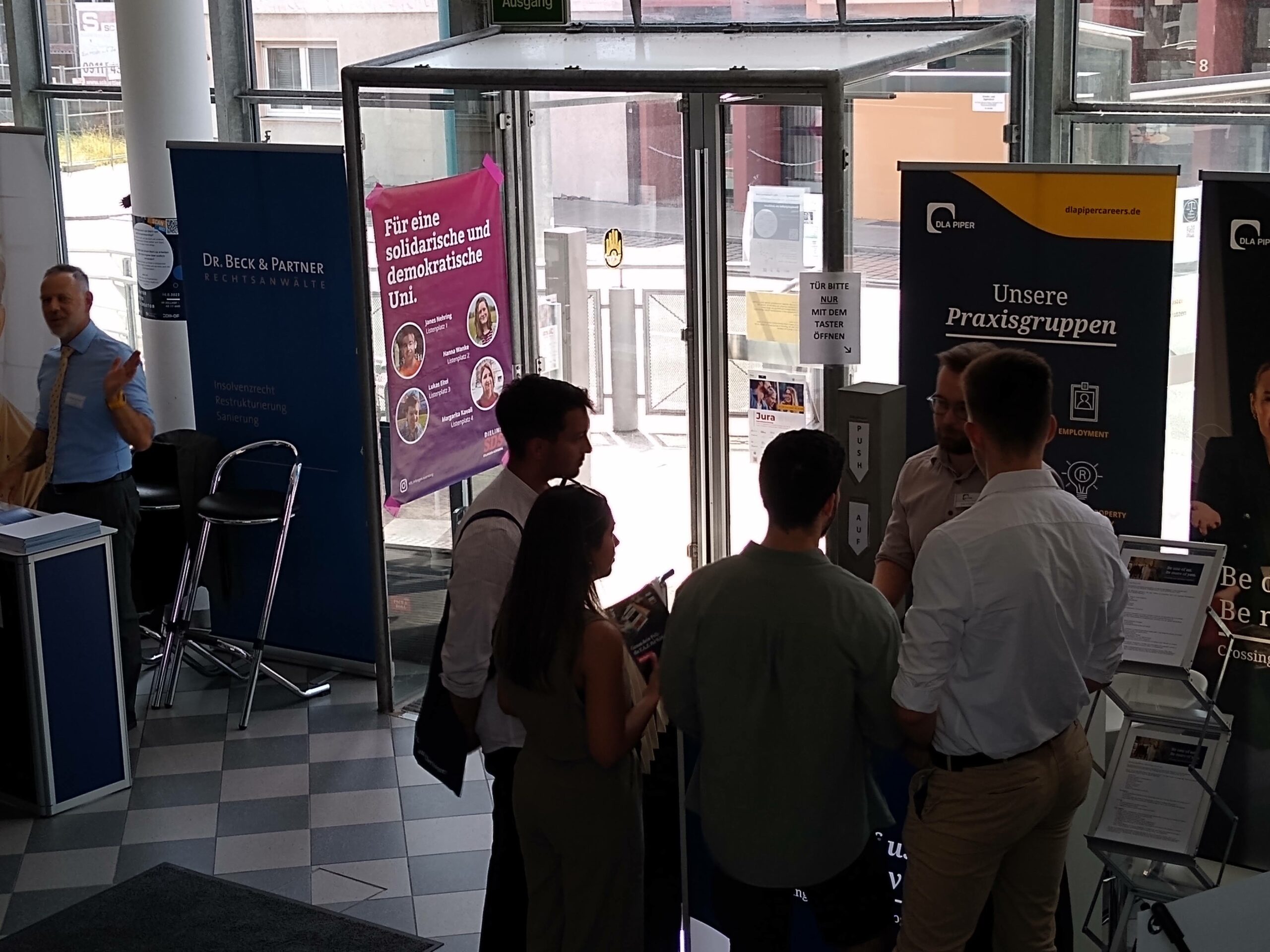Am 21. und 22. Juni fand für uns Studierende der Fakultätskarrieretag Jura statt, organisiert vom Fachbereich Rechtswissenschaft der FAU und dem Verein a*jfe – Alumni der Juristischen Fakultät Erlangen e. V. Die anwesenden Ausstellerinnen und Aussteller, hauptsächlich Kanzleien aus der Umgebung, hatten im Foyer des Juridicums kleine Messestände aufgebaut, um uns angehende Juristinnen und Juristen über Möglichkeiten zu Referendariatsstationen, Festanstellungen und Nebentätigkeiten sowie Praktika zu informieren.
