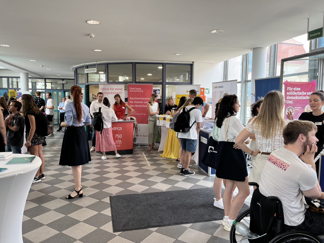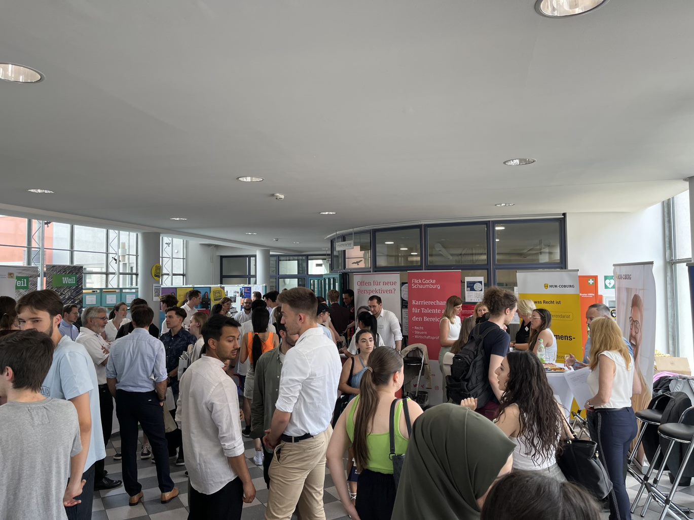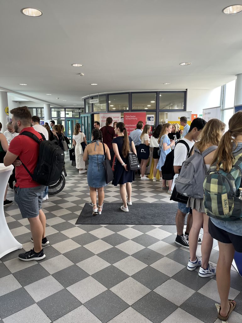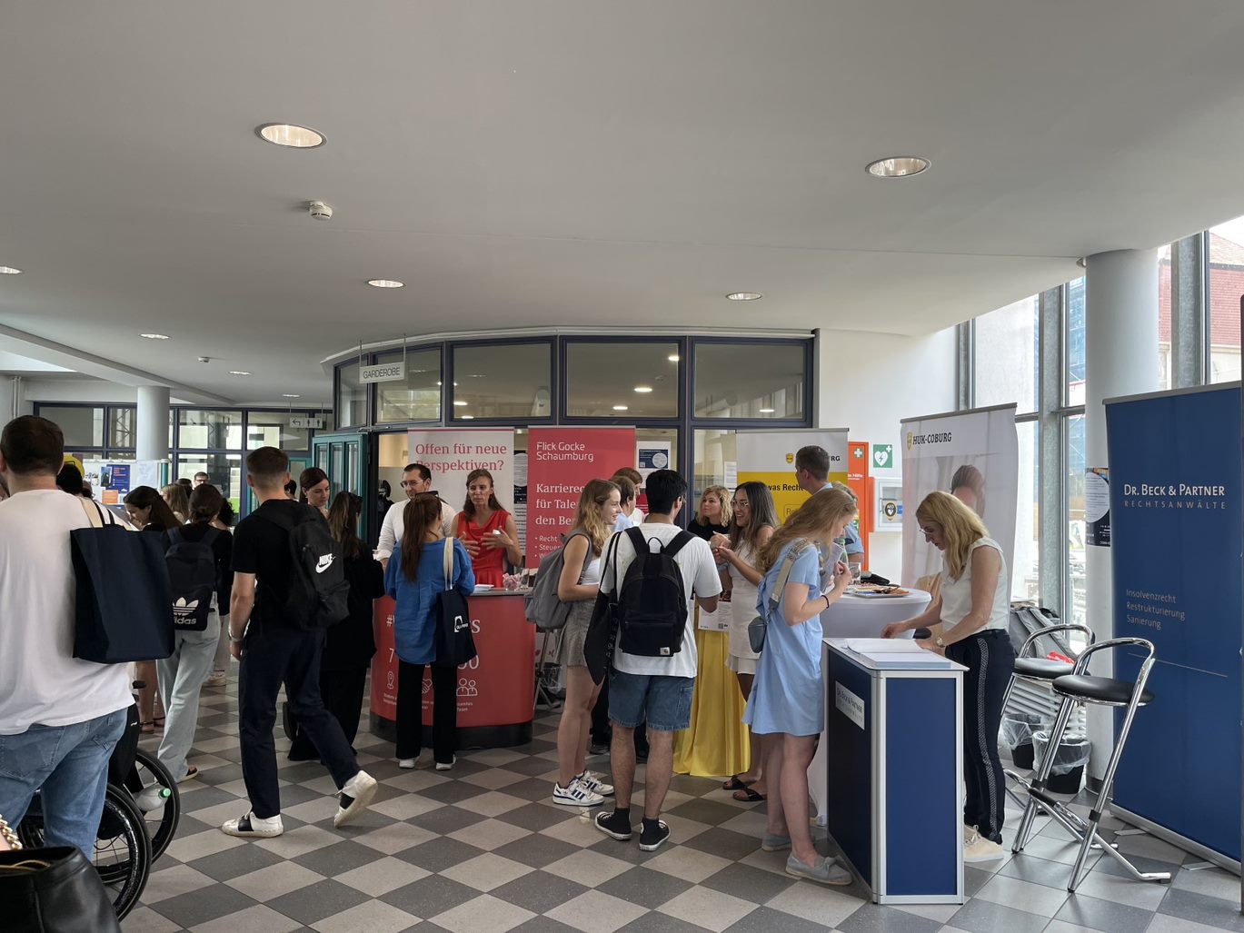 Trotz der sehr sommerlichen Temperaturen kamen zahlreiche Studenten, um mit den Vertretern der einzelnen Ausstellerinnen und Ausstellern ins Gespräch zu kommen, sich über die Karrieremöglichkeiten zu informieren und erste Kontakte mit dem Arbeitsmarkt zu knüpfen. Es wurden viele Gespräche geführt und kleine Geschenke in Form von Kugelschreibern, Klausurenblöcken und Stoffbeuteln verteilt.
