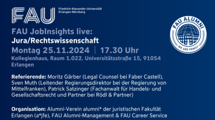 Alle Interessierten sind, auch im Namen des Alumni-Vereins a*jfe (www.ajfe.de), des FAU Alumni-Managements und des FAU Career Service sehr herzlich eingeladen.