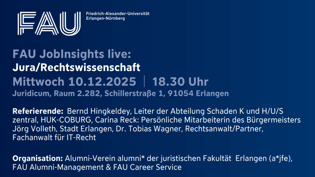 Gemeinsam mit dem Alumni-Verein alumni * der juristischen fakultät erlangen e.V. (a*jfe – http://www.ajfe.de) und dem Career Service der FAU veranstaltet das Alumni-Management der FAU „FAU JobInsights live“. Im Rahmen der Vorlesung Schuldrecht Allgemeiner Teil (PD Dr. Martin Zwickel) erarbeiten die Teilnehmer/-innen der Vorlesung einen Fall aus dem Schuldrecht, den sie mit den Referentinnen und Referenten der Veranstaltung diskutieren wollen. Im Rahmen der Lösung des Falles werden die Referentinnen und Referenten, die selbst an der FAU studiert haben, darauf eingehen, wie der Fall in der Praxis gelöst werden könnte und welche Bedeutung derartige Fallgestaltungen für die jeweiligen Berufsbilder haben. Dabei lernen die Studierenden auch verschiedene juristische Berufsbilder kennen. Bei Getränken und Snacks besteht nach der Veranstaltung Gelegenheit zum Austausch.