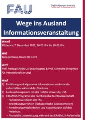 Am Mittwoch, dem 7. Dezember 2022, findet von 16:00 bis 18:00 Uhr im Kollegienhaus, Raum KH 1.019, eine Informationsveranstaltung zum Thema Auslandsaufenthalt während des Studiums statt. Die Professoren Freitag (ERASMUS-Koordinator) und Schmolke (Prodekan für Internationalisierung) laden Sie herzlich dazu ein, der Veranstaltung beizuwohnen. Einen Flyer mit näheren Informationen finden Sie hier.