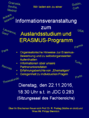 Auch in diesem Jahr findet wieder ein Informationsveranstaltung zum Thema Auslandsstudium und ERASMUS-Aufenthalt statt. Zeitpunkt und Ort: 22. November 2016, 18:30 Uhr s.t. im JDC 0.283. Nähere Infos erhalten Sie hier.