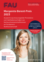 Der Fachbereich Rechtswissenschaft zeichnet 2023 hochkarätige Nachwuchswissenschaftlerinnen mit dem Margarete-Berent-Preis aus. Dabei wird ein Promotionsvorhaben und ein Forschungsvorhaben von Postdoktorandinnen, Habilitandinnen oder Juniorprofessorinnen ohne Tenure Track prämiert. Der Preis wird in Gestalt von Sachmitteln von in Höhe von 2.500 € pro Preisträgerin vergeben. Damit soll für ein Jahr die Durchführung des wissenschaftlichen Projekts der Preisträgerin gefördert werden.