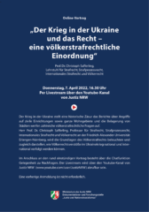 Der Krieg in der Ukraine stellt eine historische Zäsur dar. Berichte über Angriffe auf zivile Einrichtungen sowie ganze Wohngebiete und die Belagerung von Städten werfen zahlreiche völkerstrafrechtliche Fragen auf. Herr Prof. Dr. Christoph Safferling, Professor für Strafrecht, Strafprozessrecht, Internationales Strafrecht und Völkerrecht an der Friedrich-Alexander-Universität Erlangen-Nürnberg, wird am Donnerstag, den 7. April 2022, um 16:30 Uhr die Grundlagen des Völkerstrafrechts beleuchten und zugleich darstellen, wie Völkerrechtsverstöße im Ukrainekrieg national und international verfolgt werden können.