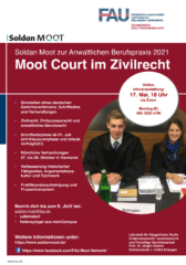 Der Soldan Moot Court geht in die 9. Runde und wir suchen Dich als Teilnehmer! Höre Dir am 17. Mai 2021 gerne weitere Informationen an, kläre weitere Fragen und bewirb Dich bis zum 6. Juni 2021 für einen Platz im Team!