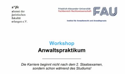 Der Verein Alumni der Juristischen Fakultät Erlangen e. V. und das Institut für Anwaltsrecht und Anwaltspraxis des Fachbereichs Rechtswissenschaft bieten im Sommersemester 2023 wieder eine strukturierte Praktikumsausbildung an.