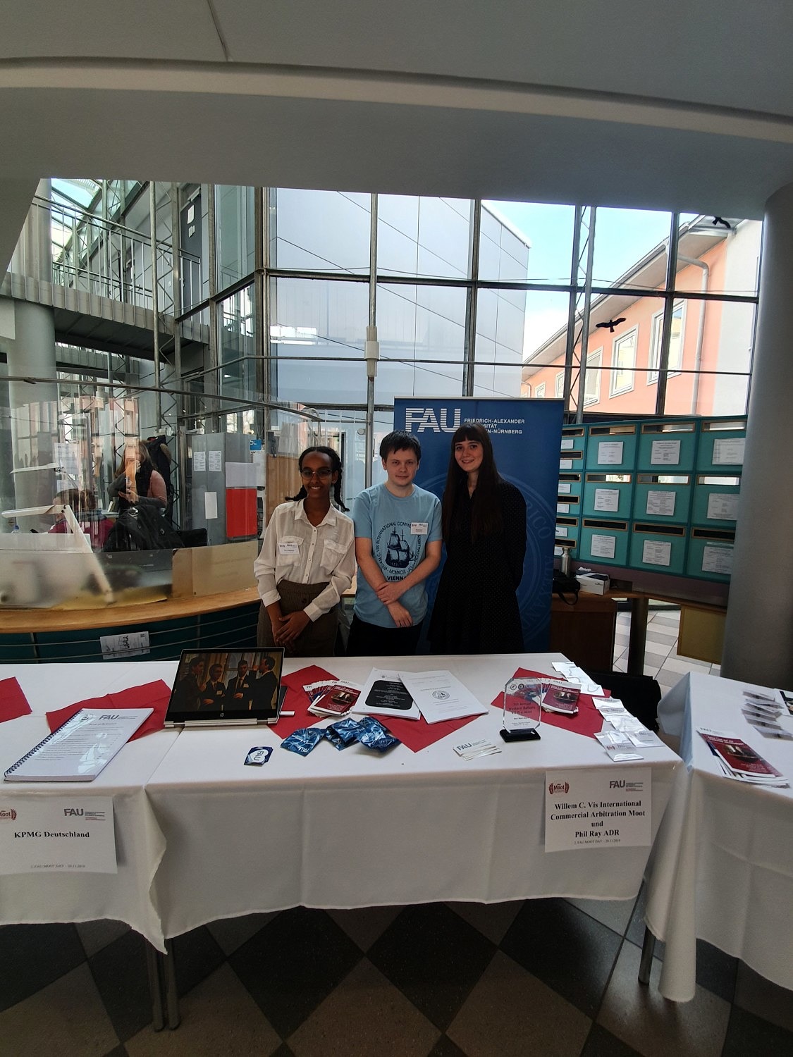 Zahlreiche interessierte Studierende folgten der Einladung des FAU Moot Network und besuchten die im Foyer des Juridicums stattfindende Moot Messe. Dort präsentierten sich eine Auswahl der am Fachbereich Rechtswissenschaft angesiedelten Moots sowie diese unterstützende Kanzleien. Bei Kaffee und Waffeln konnten die neugierigen Besucher Fragen an aktuelle und ehemalige Teammitglieder und Betreuer stellen. Daneben bot sich in einer eigens für den FAU MOOT DAY inszenierten Moot Show, die Möglichkeit, eine Verhandlung live mitzuerleben. Das FAU Nuremberg Moot Court Team 2019 stellte einen Auszug aus dem dort verhandelten Fall vor.
