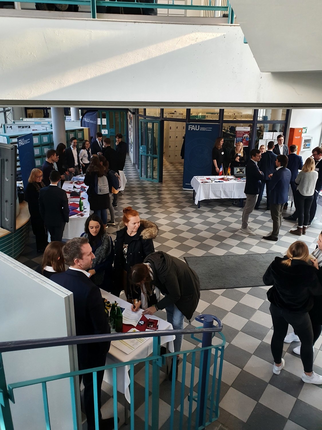 Zahlreiche interessierte Studierende folgten der Einladung des FAU Moot Network und besuchten die im Foyer des Juridicums stattfindende Moot Messe. Dort präsentierten sich eine Auswahl der am Fachbereich Rechtswissenschaft angesiedelten Moots sowie diese unterstützende Kanzleien. Bei Kaffee und Waffeln konnten die neugierigen Besucher Fragen an aktuelle und ehemalige Teammitglieder und Betreuer stellen. Daneben bot sich in einer eigens für den FAU MOOT DAY inszenierten Moot Show, die Möglichkeit, eine Verhandlung live mitzuerleben. Das FAU Nuremberg Moot Court Team 2018, welches mit seinem Einzug in das Halbfinale dieses Jahr besonders glänzte, stellte einen Auszug aus dem dort verhandelten Fall vor.