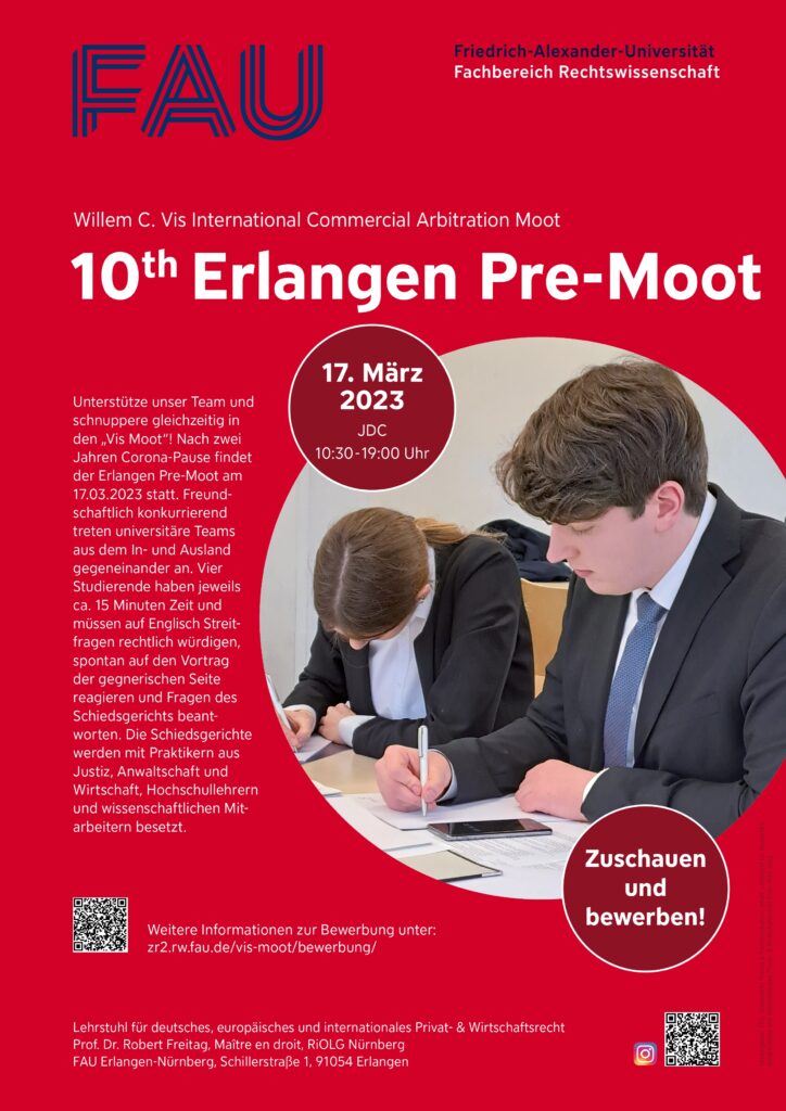 Statt wie in den vergangenen Jahren im Rahmen eines Moot Days in den Räumlichkeiten der FAU Erlangen-Nürnberg über das Angebot der Moot Courts zu informieren, werden wir in diesem Jahr über den Monat November sukzessive online verschiedene Inhalte und Informationen zur Verfügung stellen. Dabei werden sich verschiedene Moot Courts vorstellen. Außerdem werden Praktiker die Notwendigkeit der Erarbeitung und Verbesserung der eigenen Darstellungsfähigkeiten erläutern. Bereits in der Vergangenheit haben viele unterschiedliche Institutionen die Moot Courts unterstützt, wobei gerade auch bei Pre-Moots in größeren Kanzleien wertvolle Kontakte für spätere Praktika und den späteren Berufseinstieg geknüpft werden konnten.