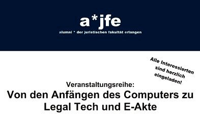 Das Thema Legal Tech bewegt derzeit die juristische Berufswelt. Teilweise findet es auch schon Eingang in die juristische Ausbildung. Im Januar 2018 nimmt sich der Alumni-Verein a*jfe des Themas mit einer Vortragsreihe „Von den Anfängen des Computers zu Legal Tech und E-Akte“ an.
