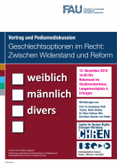 Das Centre für Human Rights Erlangen-Nürnberg (CHREN), das Interdisziplinäre Zentrum Gender Differenz Diversität (IZGDD) und der Fachbereich Rechtswissenschaft laden am 15. November 2019 zu einem Vortrag mit anschließender Podiumsdiskussion zum Thema „Geschlechtsoptionen im Recht zwischen Widerstand und Reform“ ein. Die Veranstaltung widmet sich insbesondere der Einführung der dritten Geschlechtsoption „divers“ in das deutsche Recht und soll eine Diskussionsplattform für deren kritische Reflexion bieten.